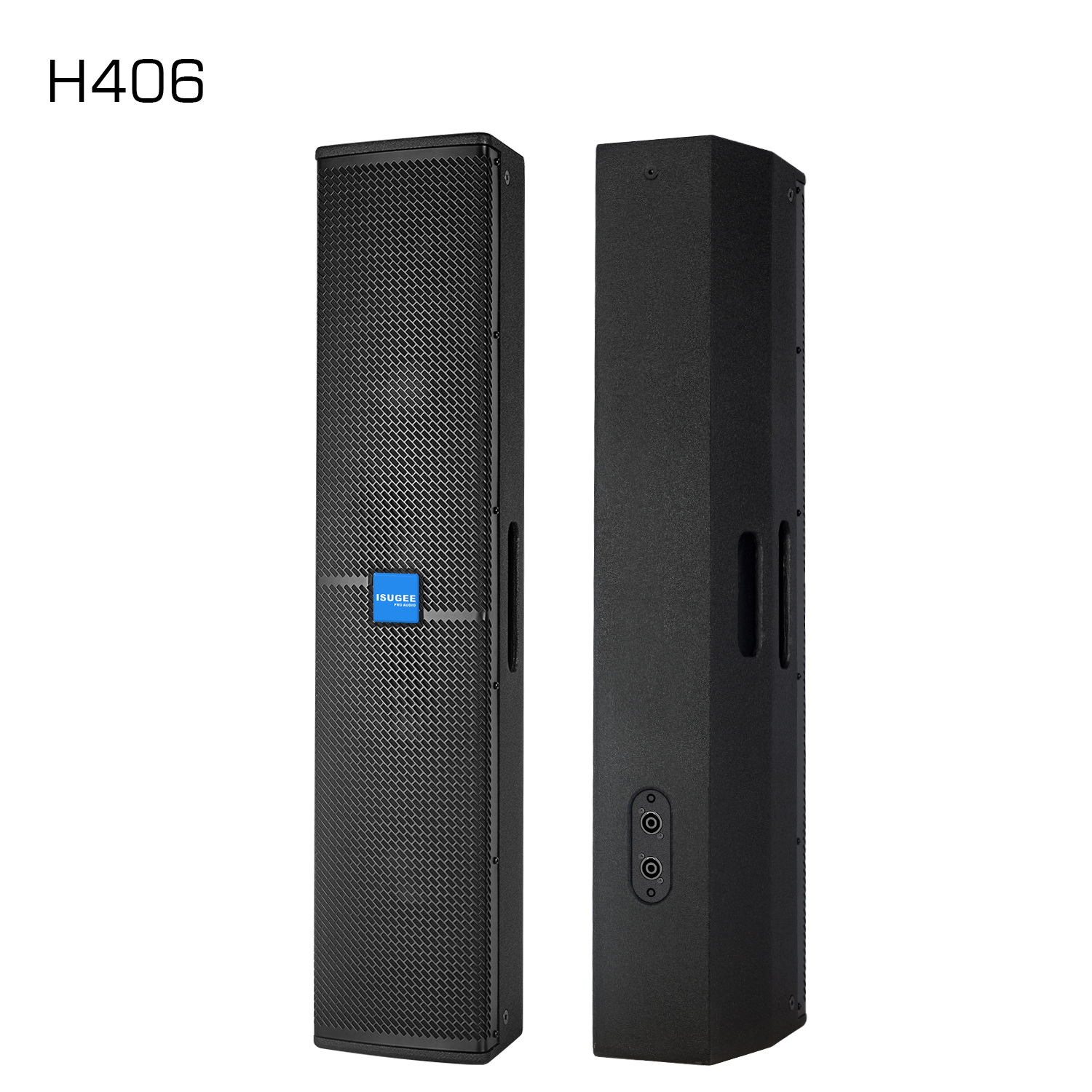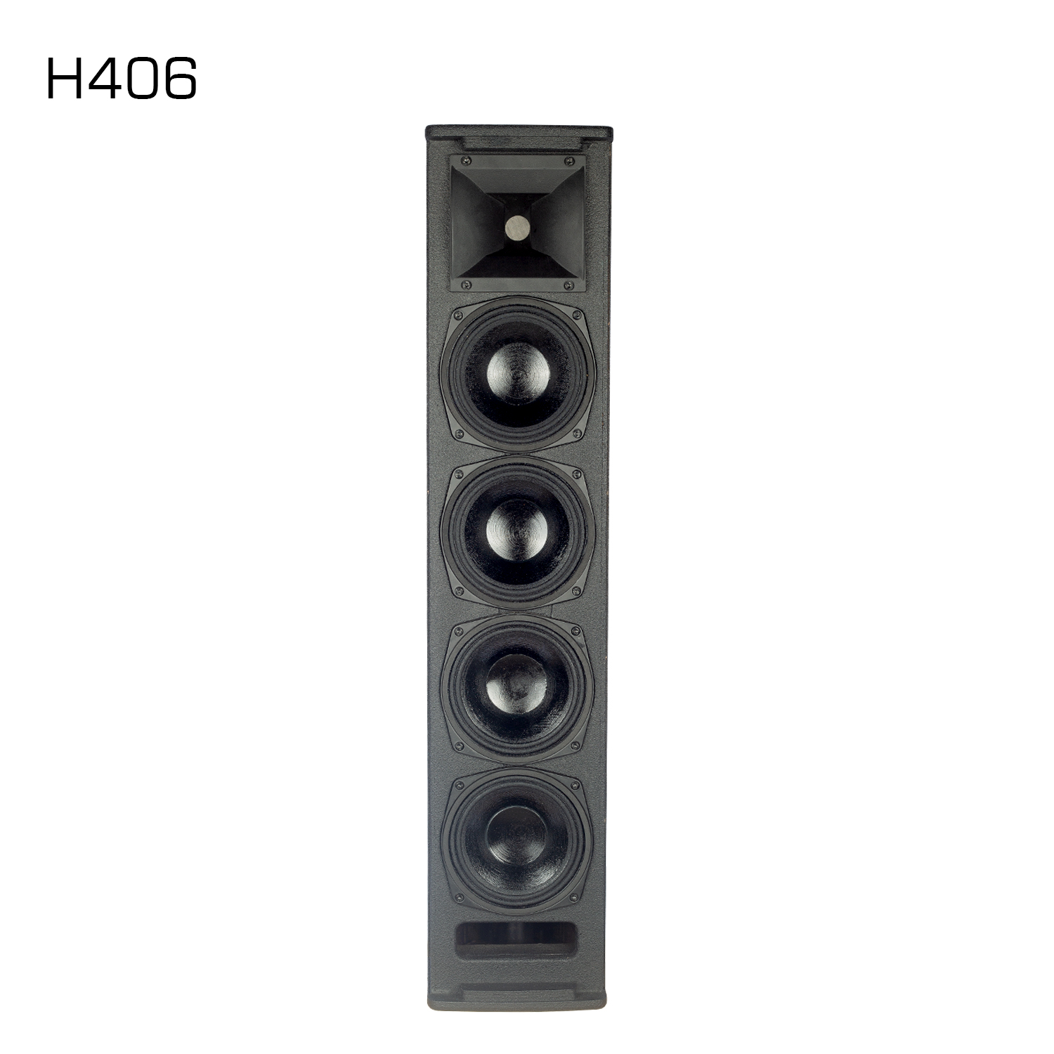 H406 70Hz-18kHz(±5dB) LF 4x6.5"(50mm Voice coil); HF 1x1.75"(44mm Voice coil neodymium unit)),1” Export 600W (RMS)/1200W(Program) 96dB 129dB 4Ω 90°H × 60°V 2xNL4 Speakon M8 Suspension pointx16pc; Basex1pc; 15mm plywood, Black Polyurea Painting 193*923*212mm Hotel/Multifunctional hall/Conference room/Performance |